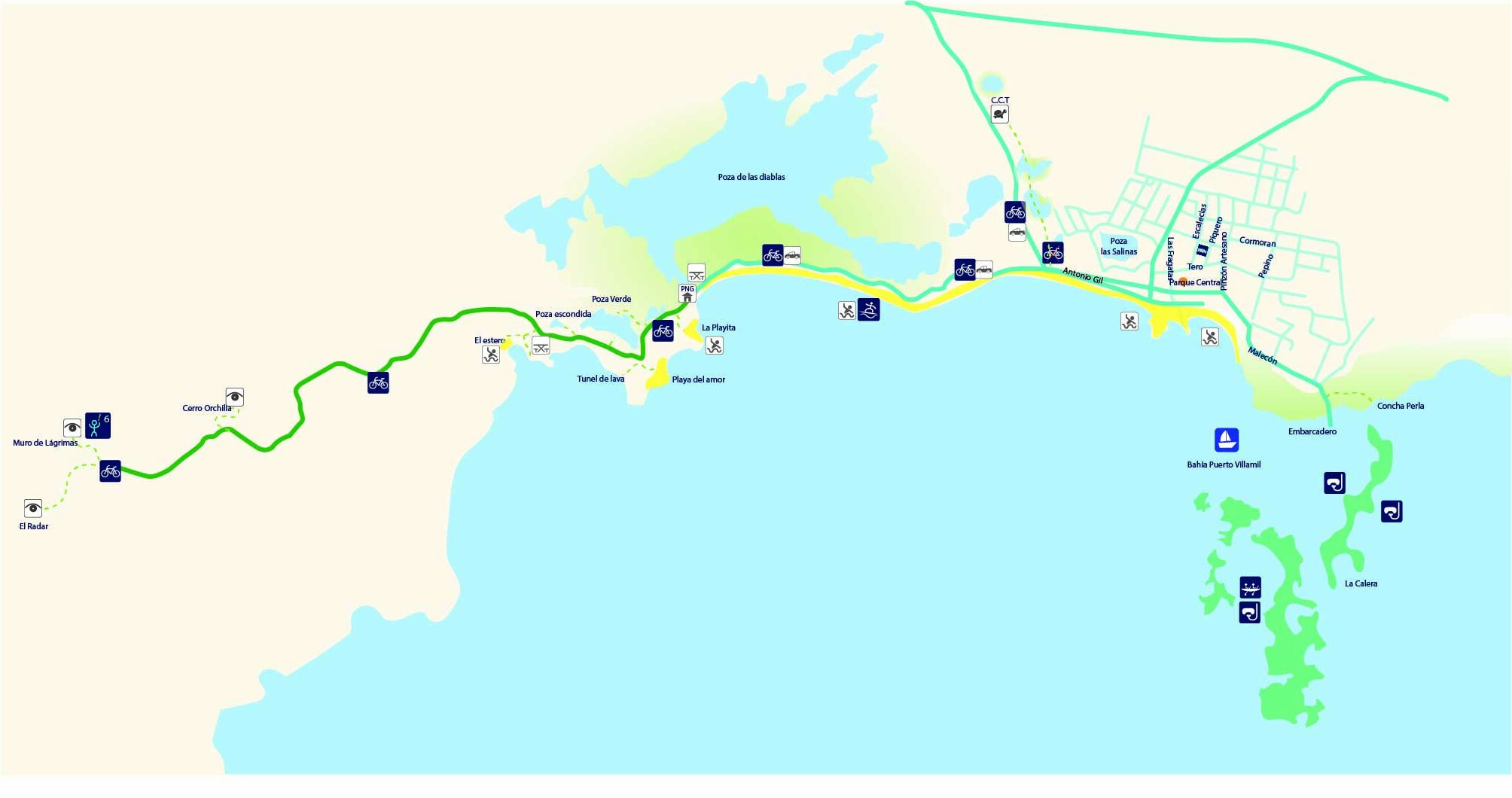 La ruta que más recomendamos a todos nuestros amigos es el Camino por los humedales hasta el mirador del Muro de las Lágrimas; y pueden realizarlo con las bicicletas de montaña o con nuestras bicis clásicas, estas últimas no tienen cambios y poseen un poco más de esfuerzo en las partes empinadas. Para que puedas elegir con mayor facilidad te explicamos un poco más sobre el camino: es una ruta de 18 km aproximadamente con un nivel de dificultad básico, ya que la mayor parte es plano hecho de arena y ripio y con algunas pendientes en la parte final. Puedes ver el océano en casi todo momento y en el camino con suerte siempre hay tortugas terrestres alimentandose pero para hacer aún más relajado el paseo puedes tomar descansos en hermosas playas como la Playa del Amor o meditar en el Estero que tiene una magnífica sombra por la presencia de muchos mangles.